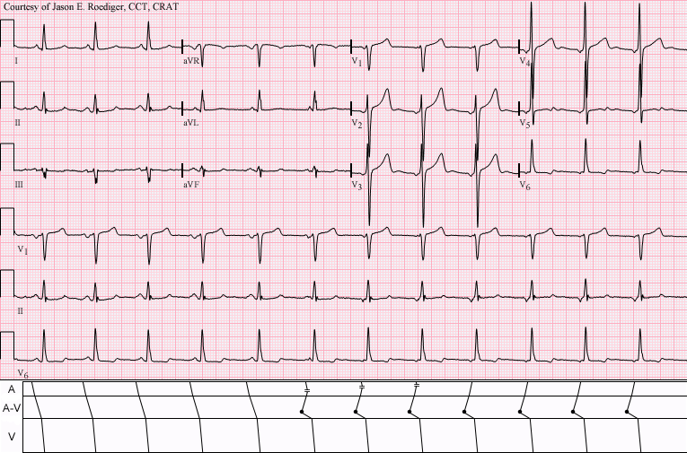 - Ondas P preceden, se funden o aparecen tras QRS; consecuentemente, los espacios P-R son más cortos que en el ritmo sinusal. Si las ondas P preceden al QRS son retrógradas (negativas) en las derivaciones II, III y aVF son también negativas en V5 y V6 pero en aVR son positivas.