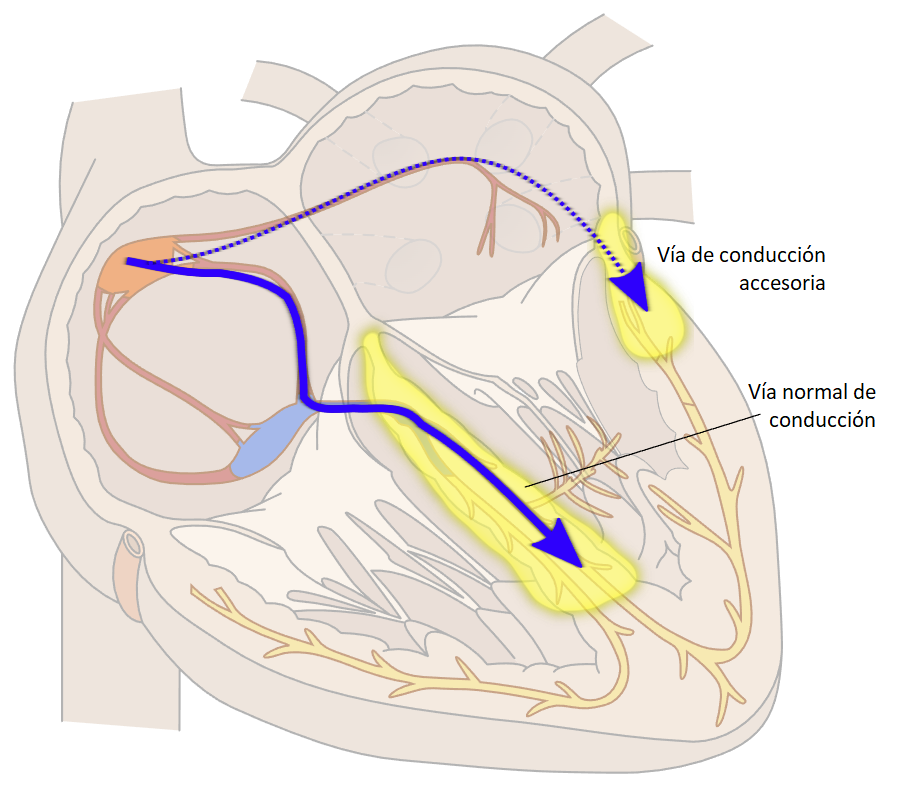 - Se han encontrado varias vías de conducción eléctrica distintas en el corazón que conducen los impulsos eléctricos desde las aurículas a los ventrículos más directamente, sin pasar por el nódulo AV, el haz de His o ambos. Estas vías de conducción accesorias activan los ventrículos antes de lo que lo harían si los impulsos eléctricos viajaran normalmente por el sistema de conducción eléctrica. Estas vías existen en todos los corazones, pero bajo ciertas condiciones pueden conducir a la despolarización prematura de los ventrículos, lo que resulta en preexcitación ventricular y síndrome de preexcitación. Las más comunes de estas vías de conducción accesorias son las vías (o conexiones) AV accesorias, que conducen los impulsos eléctricos desde las aurículas directamente a los ventrículos.