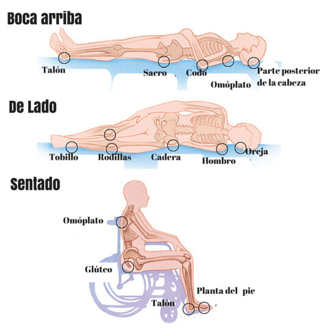 - En decúbito supino la mayor presión se presenta en los talones y en la región glútea. En la posición sedente las zonas de mayor riesgo son las tuberosidades isquiáticas, mientras que en decúbito lateral la mayor presión se presenta sobre el trocánter mayor.