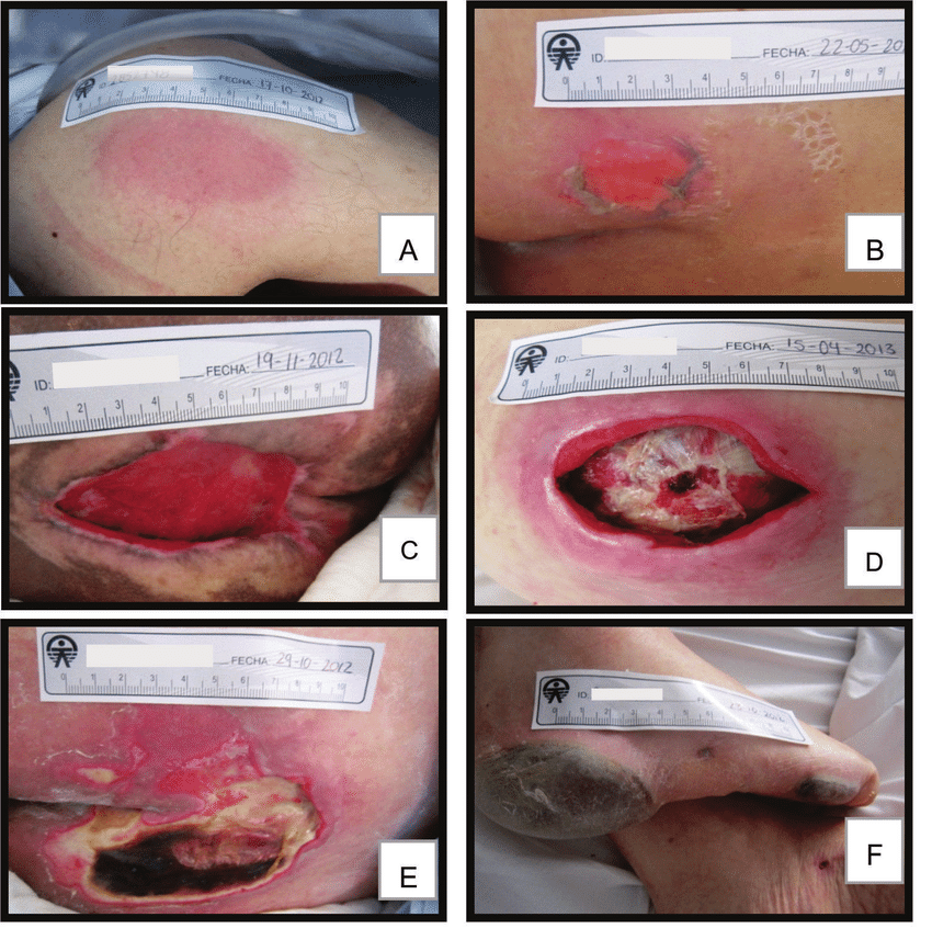 - El examen de la piel no es propiamente una evaluación física neurológica, se presenta aquí para destacar su importancia ya que las úlceras por presión son complicaciones graves del paciente con discapacidad del SNC. Estas úlceras se localizan en la piel y en los tejidos subyacentes, generalmente sobre una prominencia ósea, como resultado de la presión o de la presión combinada con fuerzas de desgarro. En el paciente que no puede realizar cambios de posición en el lecho, los tejidos blandos reciben presiones de aproximadamente 150 mm Hg.