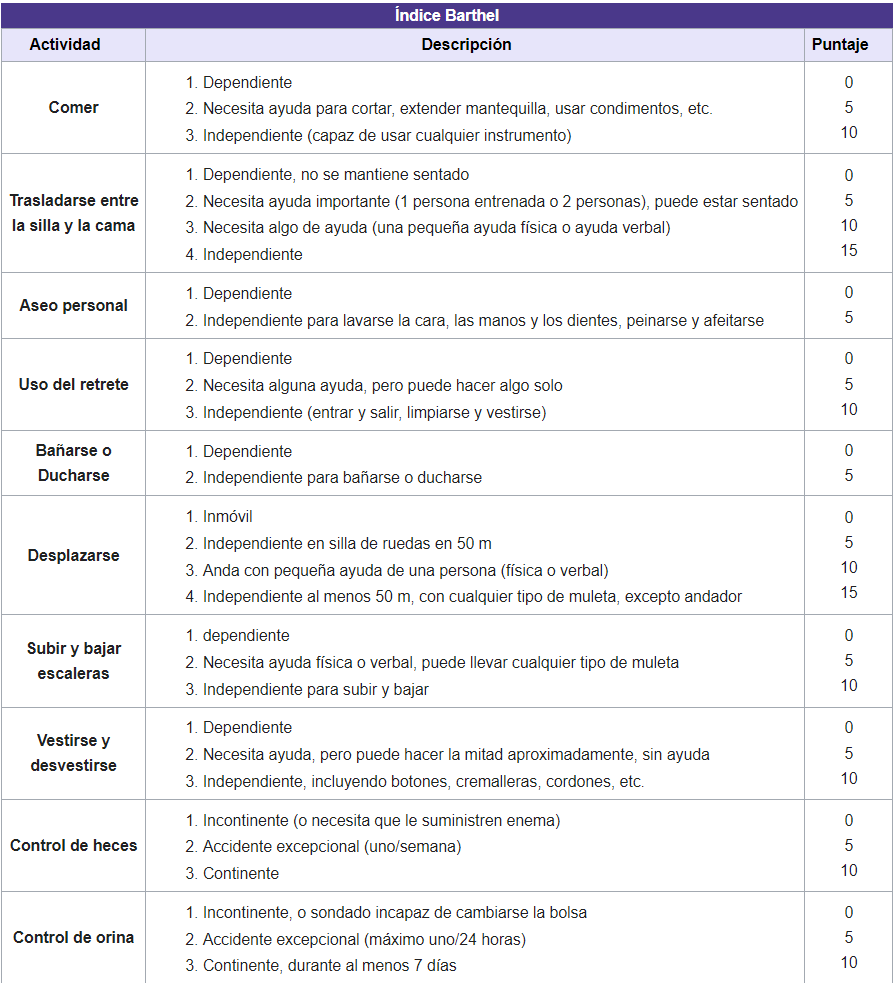 - El uso de escalas para la evaluación de la discapacidad permite un interrogatorio ordenado y un manejo más útil de la información. Estas pueden ser genéricas, aplicables a múltiples enfermedades, o específicas. En la mayoría de enfermedades músculo-esqueléticas, las preguntas las debe responder el paciente; sin embargo, en algunos casos las preguntas pueden ser respondidas por el acompañante. La aplicación de la escala de Barthel ayuda a determinar el grado de dependencia del paciente. La gran ventaja de la escala es su simplicidad que permite aplicarla con rapidez en el consultorio o al lado del paciente hospitalizado.