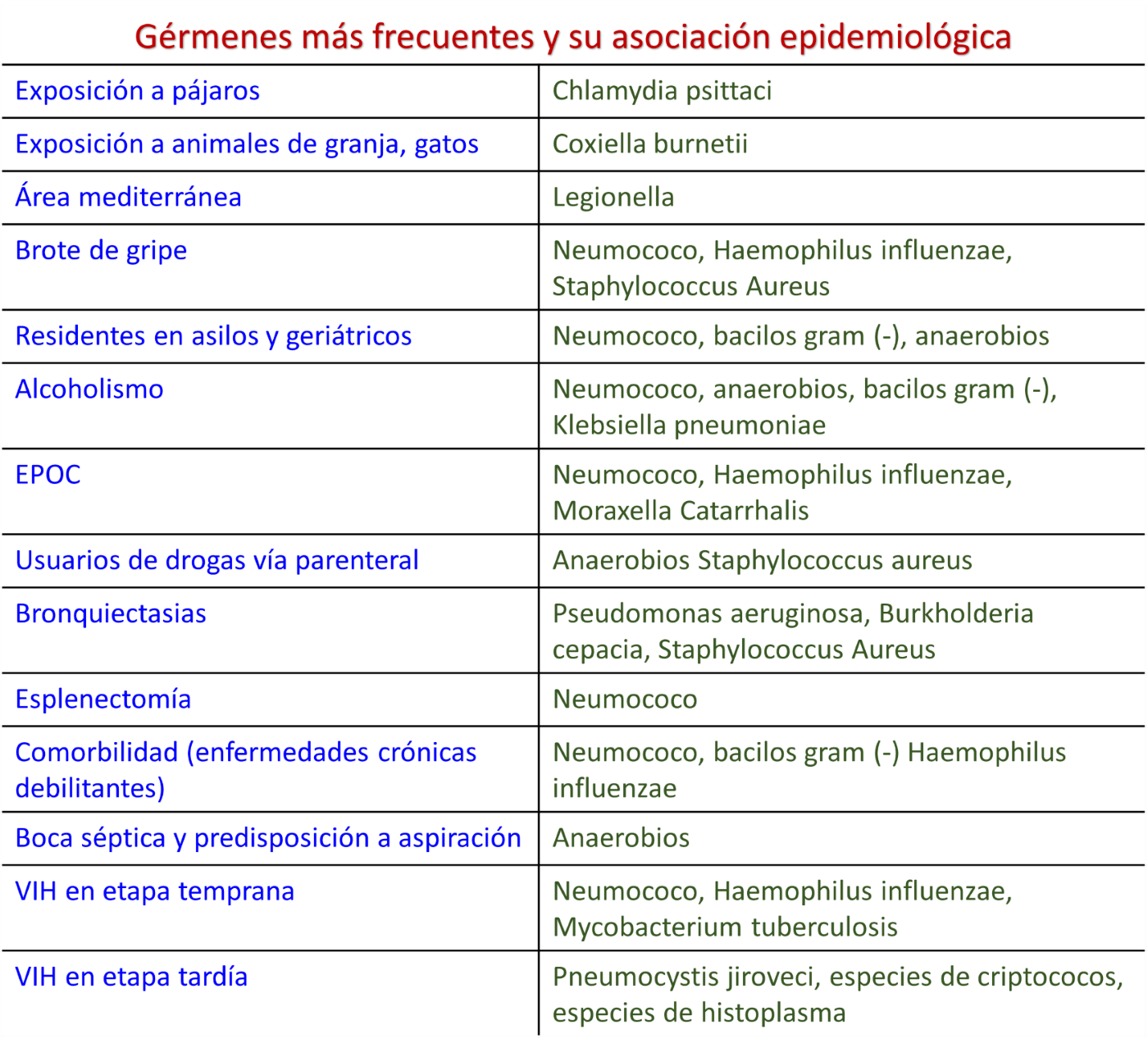- Se han estudiado clásicamente bajo los subtítulos organismos "típicos" y "atípicos" en términos de facilidad de cultivo positivo. Los organismos típicos comunes incluyen Pneumococcus , Haemophilus influenzae , Moraxella catarrhalis , Group A Streptococcus y otros organismos aerobios y anaerobios gramnegativos. Los organismos atípicos comúnmente vistos en la práctica clínica incluyen Legionella , Mycoplasma , Chlamydia , entre otros. Los germenes más frecuentes