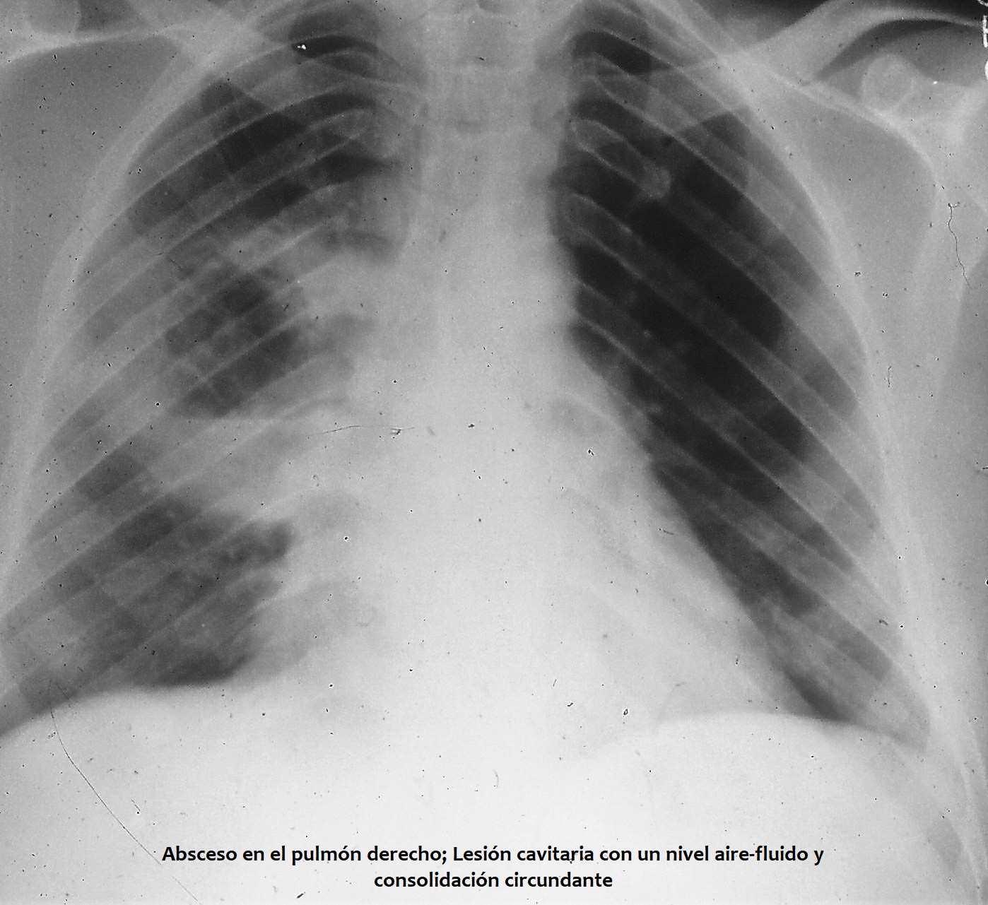- El absceso pulmonar es una acumulación circunscrita de pus en el pulmón que da lugar a la formación de una cavidad, normalmente con un nivel hidroaéreo visible en la radiografía de tórax.