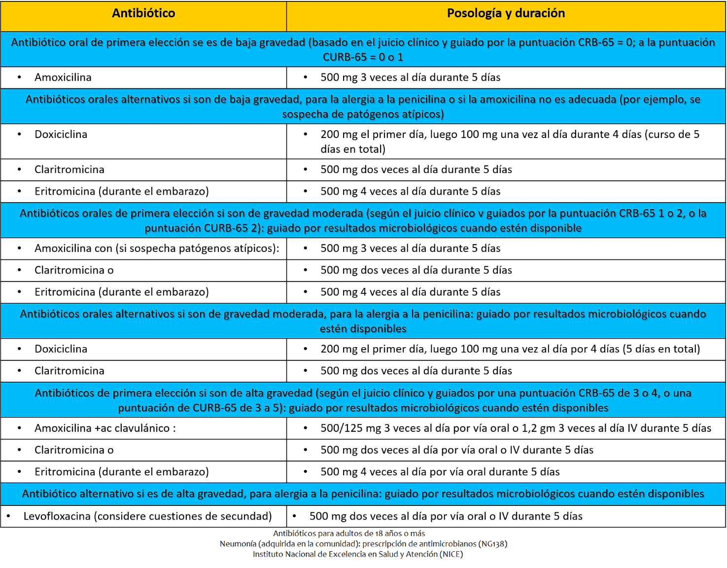- El tratamiento antibiótico empírico recomendado en las guías clínicas nacionales y extranjeras reduce la intensidad y duración de la sintomatología asociada a la neumonía, el riesgo de complicaciones y la mortalidad. En la mayoría de los casos, no es posible identificar el patógeno respiratorio que ocasiona la infección pulmonar y por esto el tratamiento antibiótico se prescribe en forma empírica. La elección del tratamiento antimicrobiano empírico debe considerar los antecedentes epidemiológicos del paciente, la estacionalidad, gravedad del caso, lugar de manejo (ambulatorio o en el hospital), el patrón de resistencia a los antimicrobianos de los microorganismos, la farmacocinética y farmacodinamia de los antibióticos, los costos del tratamiento, la disponibilidad de los medicamentos y las recomendaciones de las guías clínicas.