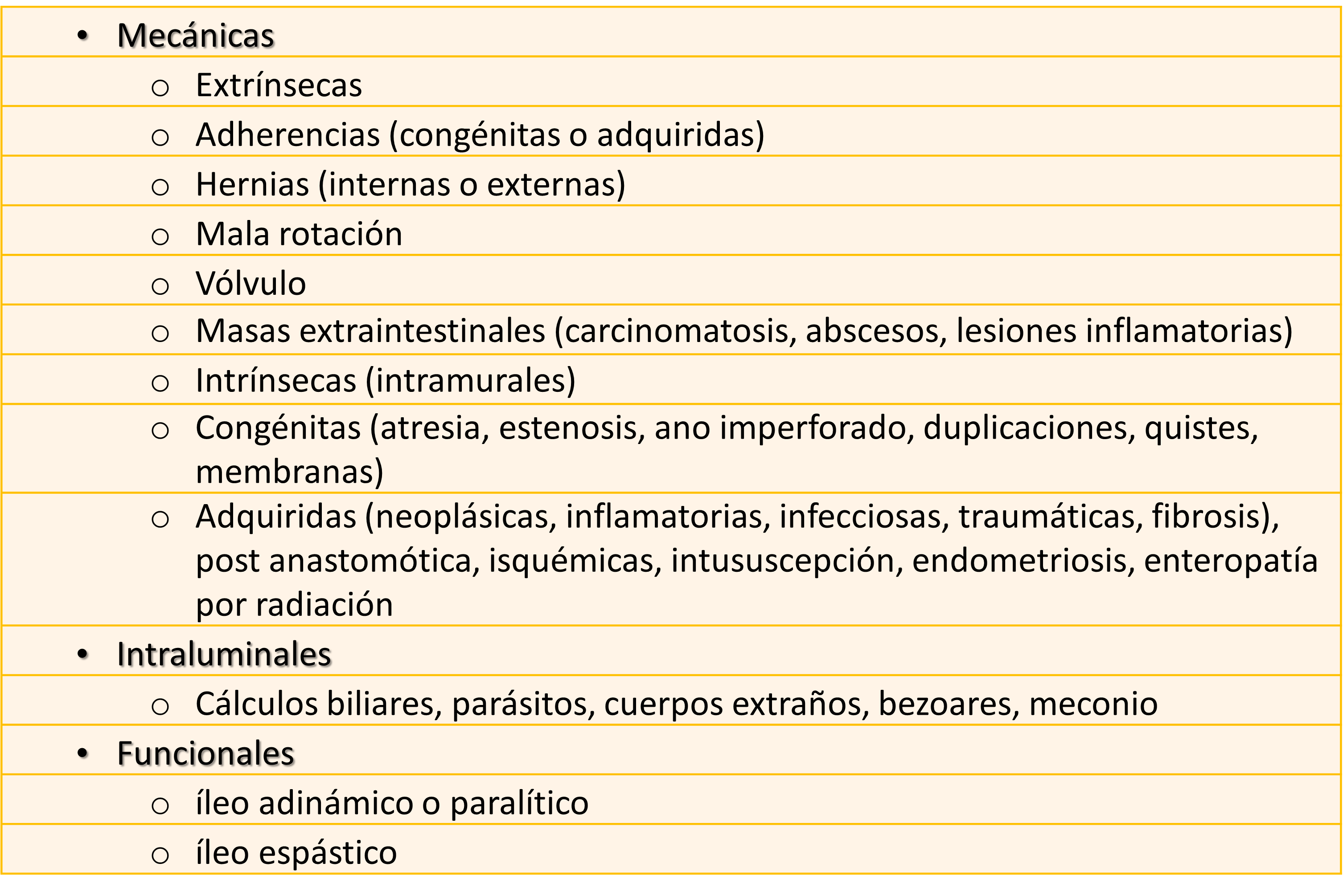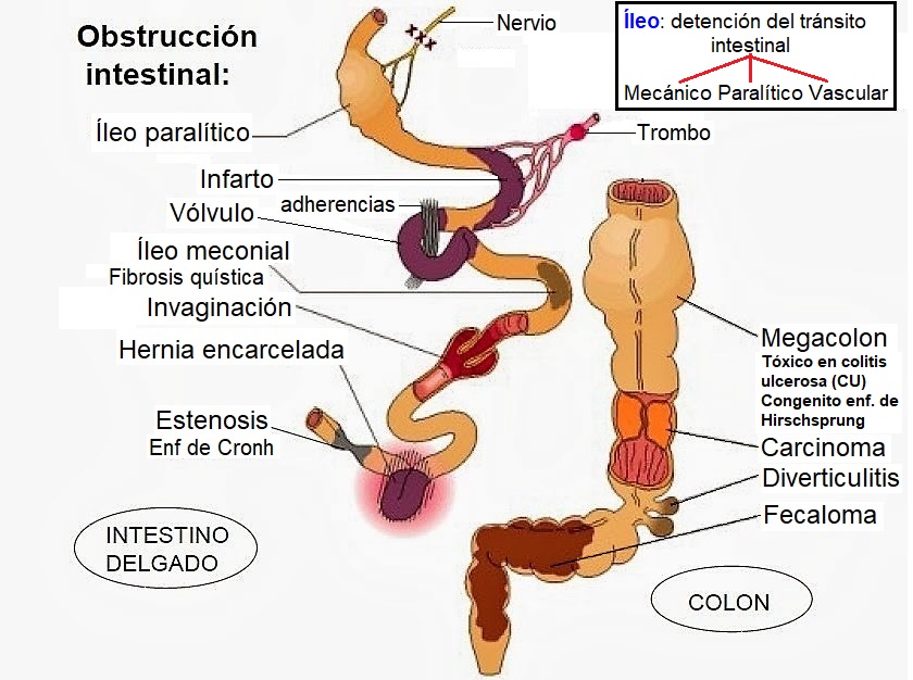 - Obstrucción baja del intestino delgado. Se presenta después de la primera asa yeyunal hasta la válvula ileocecal.