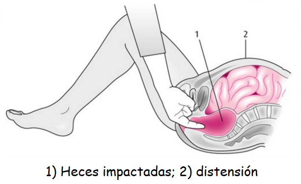- El diagnóstico es inicialmente clínico se consigue mediante un adecuado interrogatorio y exploración física; siendo obligatorio realizar un tacto rectal para descartar la presencia de un tumor en el canal anal o un fecaloma, y una exploración de los orificios herniarios inguinales para descartar que exista una hernia incarcerada. La analítica nos ayudará a ver el grado de afectación del paciente (hemoconcentración, signos de infección y alteraciones hidroelectrolíticas) mientras que la radiografía simple y en bipedestación nos guiará a la localización de la obstrucción.