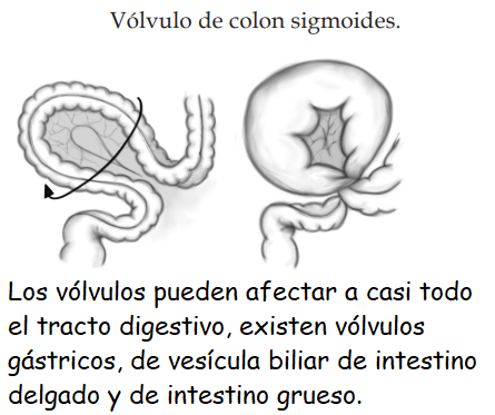 Vólvulo es una torsión del intestino sobre sí mismo que puede provocar, entre otras complicaciones, una obstrucción intestinal. Los síntomas principales son dolor abdominal, vómitos, estreñimiento y presencia de sangre de color rojo en las heces (rectorragia). Con frecuencia, la torsión afecta al mesenterio, que es la porción del peritoneo por donde transcurren los vasos sanguíneos que llevan sangre al intestino delgado, lo que provoca el colapso de las arterias que no son capaces de aportar el caudal de sangre adecuado a la pared intestinal, produciéndose una isquemia mesentérica y posteriormente a la gangrena del asa involucrada, acompañandose de fiebre, peritonitis y obstrucción intestinal.