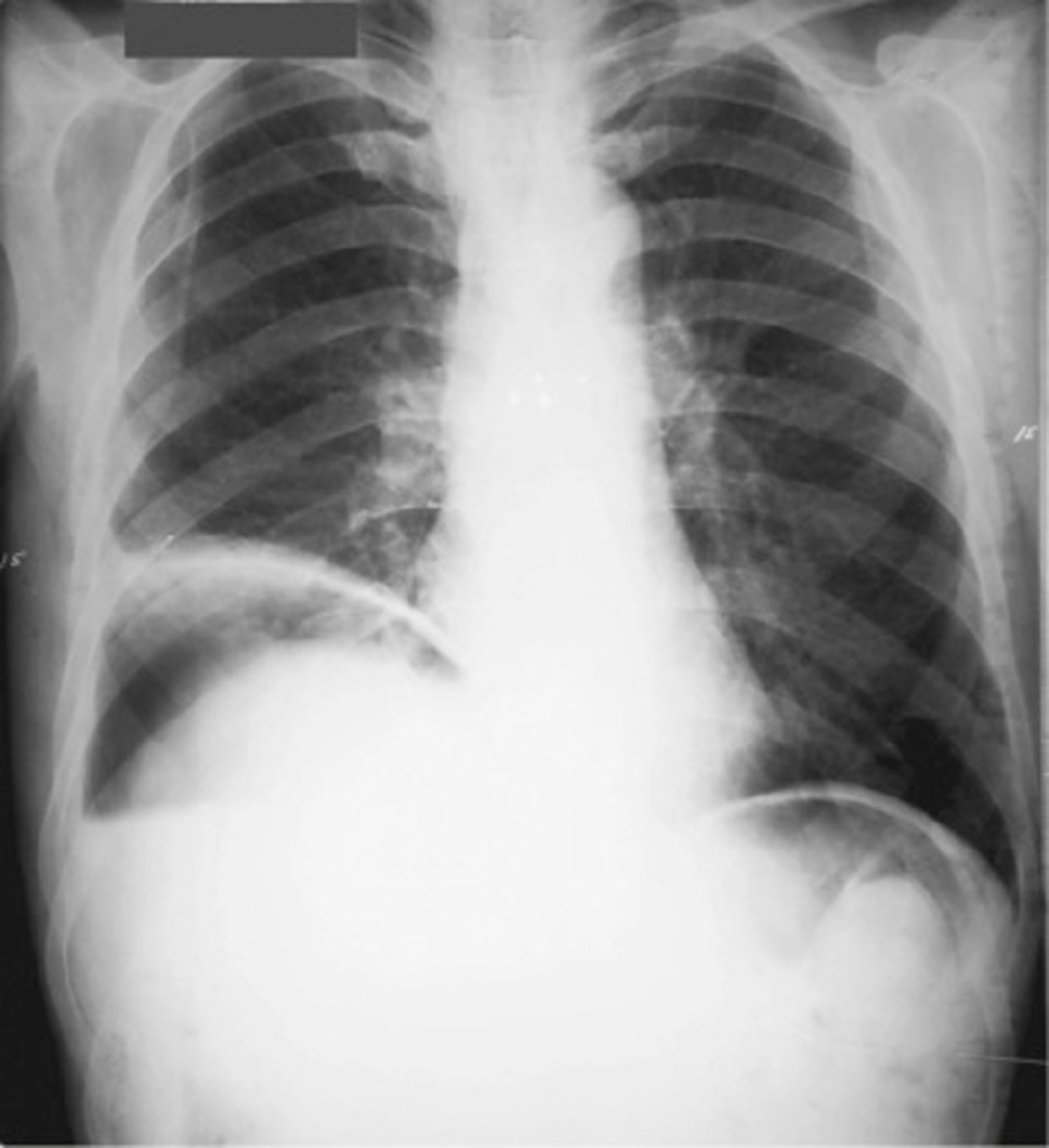 - Neumoperitoneo (aire debajo del diafragma, generalmente sobre el hígado).