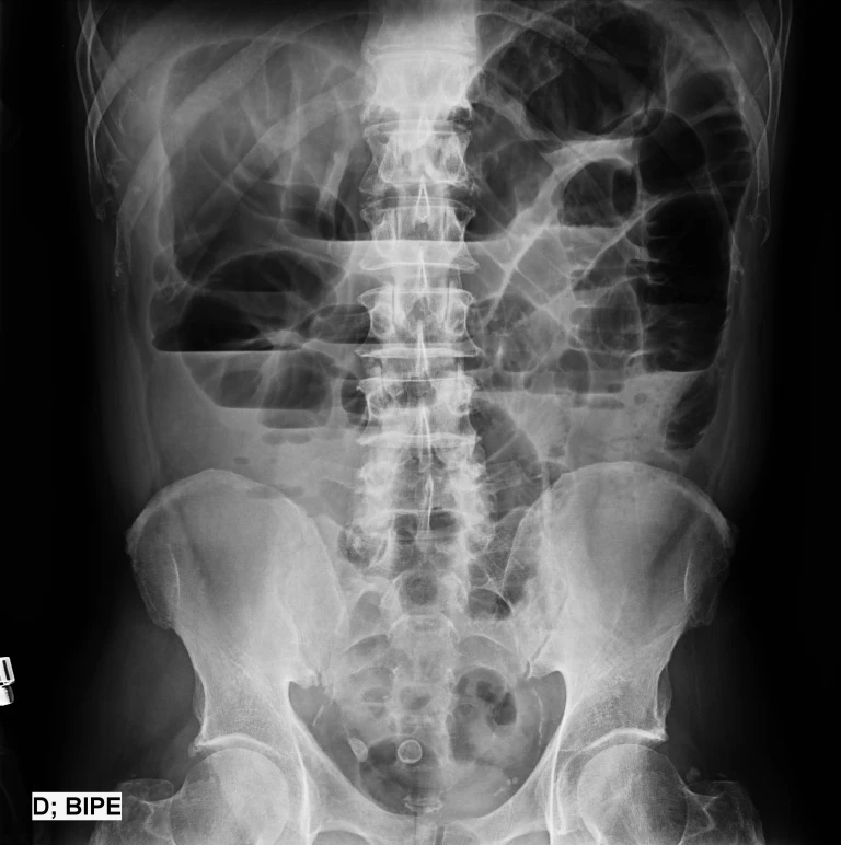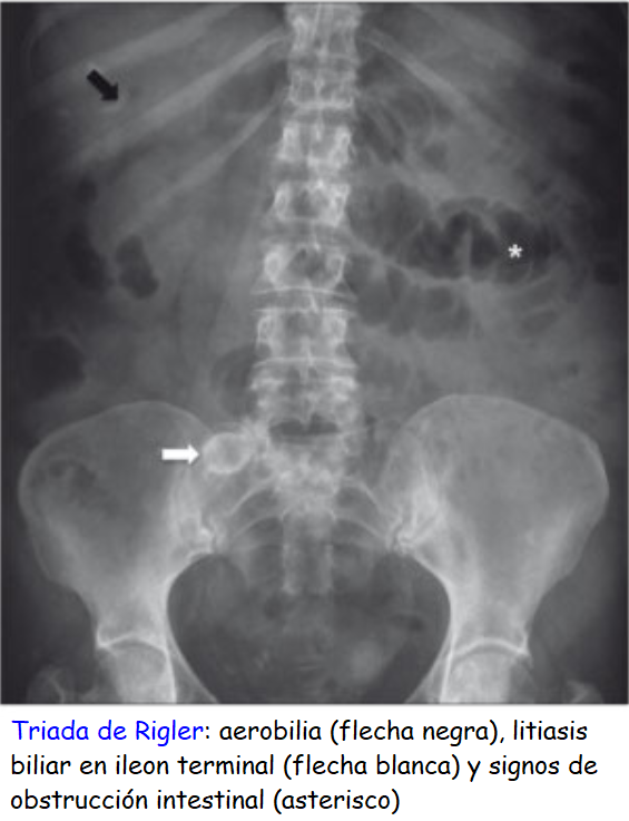 - La placa simple de abdomen de pie; en el caso de íleo biliar, en el cual el lito que pasó al duodeno a través de una fístula bilioentérica se “atora” en la válvula ileocecal. Cuando la obstrucción se encuentra en el intestino delgado no se observa aire en el colon en ninguna de las placas tomadas.