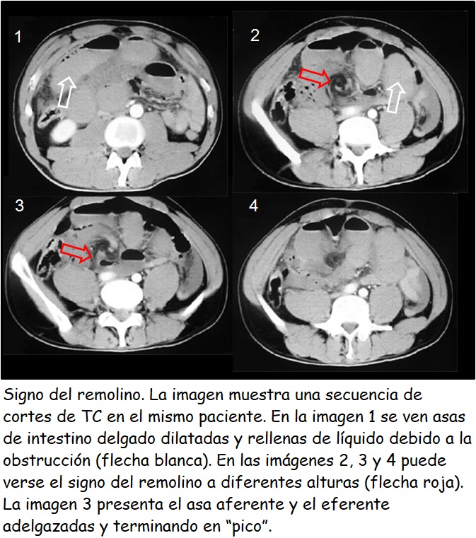 Es útil para detectar obstrucción del intestino delgado, sobre todo si la obstrucción es consecuencia de una causa extrínseca, como pueden ser tumores o abscesos; también son útiles para detectar sitios de estenosis con dilatación proximal y asas vacías distales. Los vólvulos del tracto gastrointestinal constituyen una causa importante de abdomen agudo. El examen de elección es la tomografía computada, ya que permite observar el vólvulo, así como posibles diagnósticos diferenciales. Tiene una alta sensibilidad para confirmar el diagnóstico, localizar el sitio de obstrucción e identificar la causa en la gran mayoría de los casos así como evaluar la presencia de complicaciones al permitir evaluar la vasculatura, los omentos, los mesenterios, el peritoneo, etc; en algunos casos es necesario administrar a través de la sonda nasogástrica material de contraste, por lo general hidrosoluble como el gastrografin; si se instila bario y existe perforación del intestino se corre el riesgo de salida del mismo, con la consecuente adherencia firme al peritoneo; en general, la TAC tiene sensibilidad de 80 a 90% y especificidad de 70 a 90%
