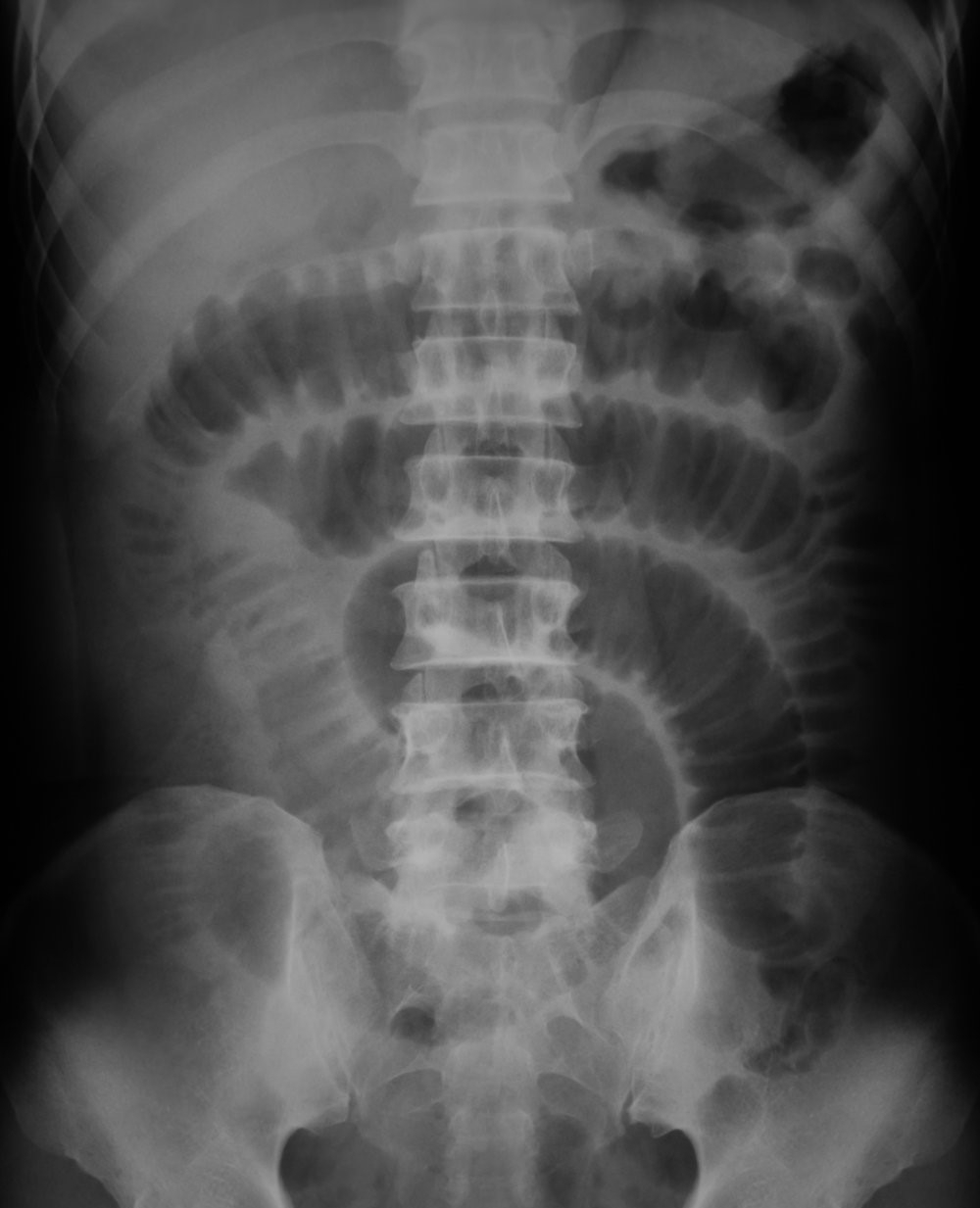 - El estudio radiológico de elección para confirmar el diagnóstico son radiografías simples en decúbito dorsal y de pie, la placa simple en decúbito dorsal muestra asas del intestino delgado dilatadas (más de 3 cm de diámetro), éstas pueden ser múltiples y en diferentes partes del abdomen, o sólo una o dos en un sitio específico.