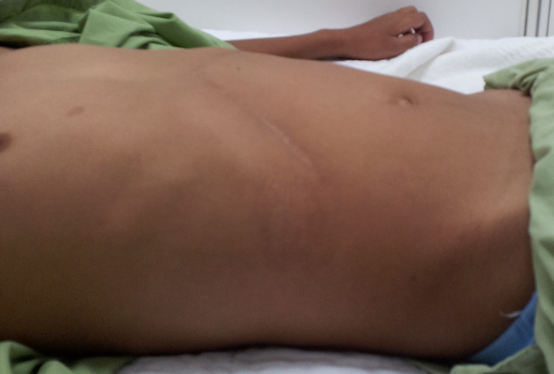 - Paciente de 33 años de edad, quien refiere presentar desde hace 5 días distensión abdominal asociada a dolor intenso y ausencia de deposiciones y de flatos luego de ingerir alimentos, acompañado de náuseas e hiporexia, de inicio insidioso y curso progresivo.