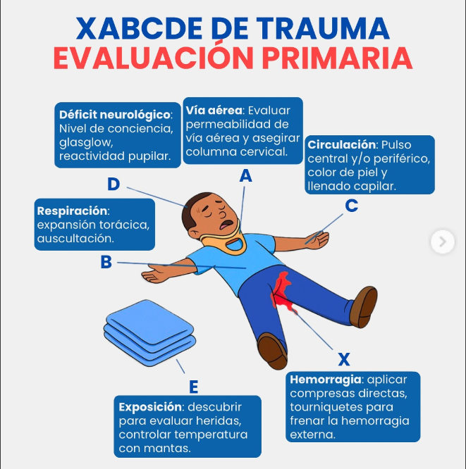 - Seguridad y Evaluación de la Escena: Confirmar que es seguro acercarse, usar EPP (precauciones universales) y determinar el mecanismo de lesión (MDL).