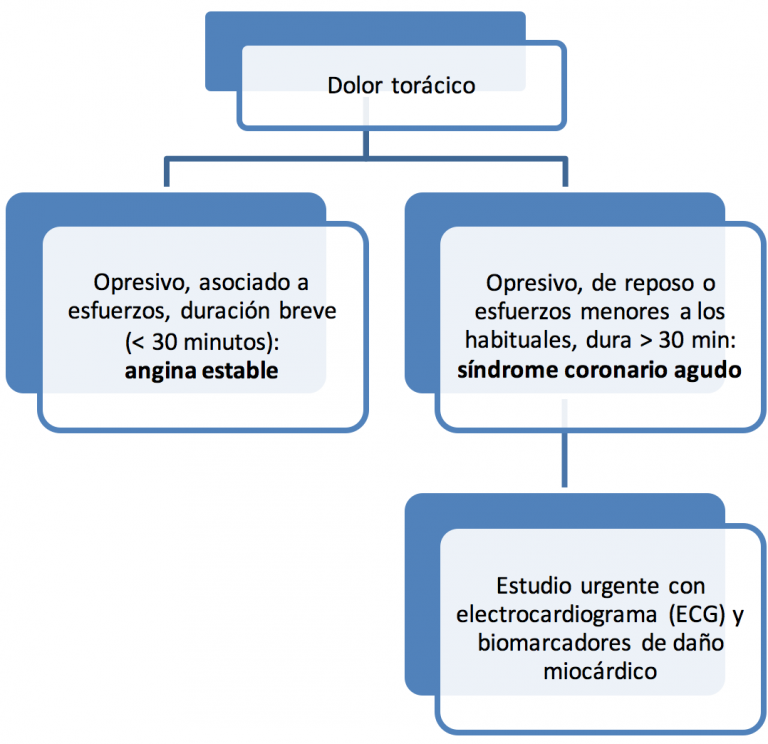 - Hallazgos positivos: Dolor típico, en un contexto de factores de riesgo cardiovascular. Si se sospecha un síndrome coronario agudo, requiere confirmación urgente con electrocardiograma y biomarcadores de daño miocárdico (creatin-quinasa [CK] con su fracción miocárdica [CK-MB], troponinas).
