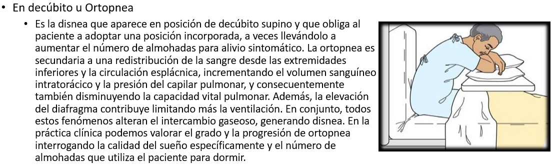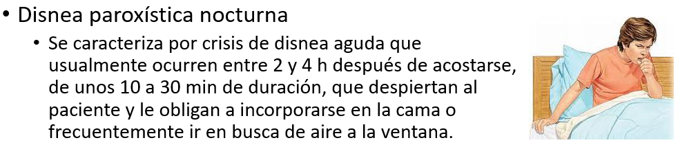 - La ortopnea (disnea en el decúbito) y la disnea paroxística nocturna (sensación de ahogo que despierta al paciente en las primeras horas de sueño) son expresiones de MAYOR GRAVEDAD