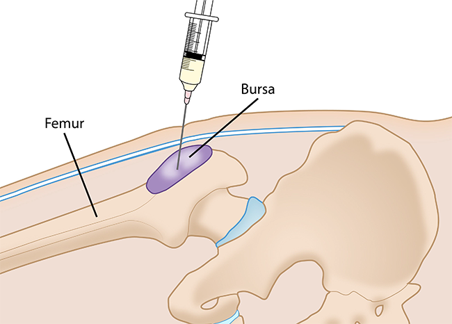 El tratamiento con infiltración local de corticoides de liberación lenta con una aguja del calibre 22 y de 9 cm para asegurar el alcance de la zona de la bolsa.