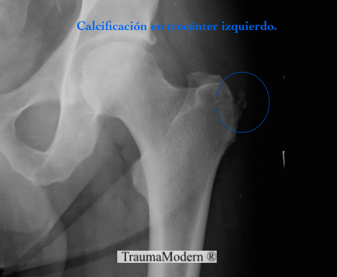 Imagen radiográfica de calcificación en trocánter de la cadera izquierda