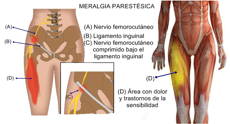 La meralgia parestésica (también conocida como atrapamiento del nervio cutáneo femoral lateral) es una enfermedad que se caracteriza por hormigueo, entumecimiento y dolor ardiente en la parte externa del muslo. Se debe a la compresión del nervio que le proporciona sensibilidad a la piel que cubre el muslo. La ropa ajustada, la obesidad o el aumento de peso y el embarazo son causas frecuentes de meralgia parestésica. No obstante, la meralgia parestésica también puede deberse a un traumatismo local o a una enfermedad, como la diabetes. Los pacientes no suelen presentar pérdida de fuerza. Los síntomas pueden empeorar con la bipedestación prolongada y la deambulación, mejorando con el reposo sentado o acostado.