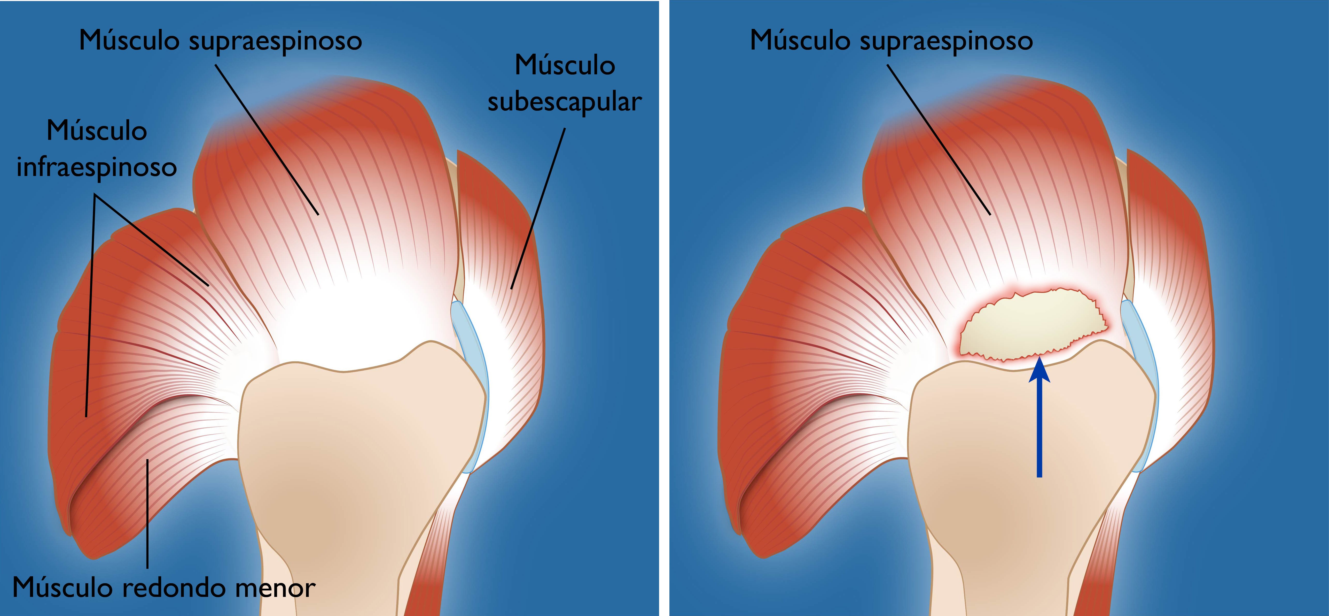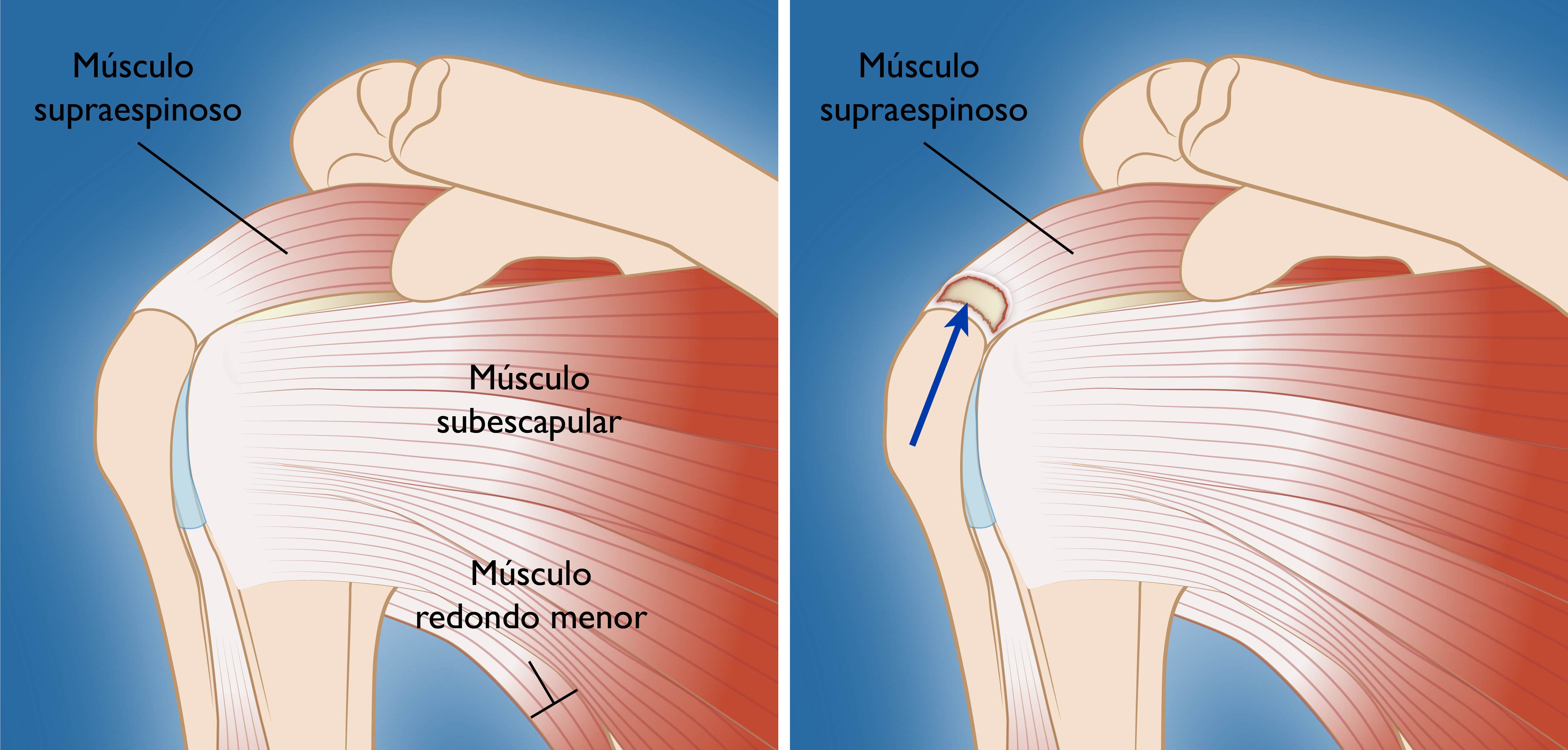(Derecha) Desgarre total del manguito rotador en el tendón supraespinoso.