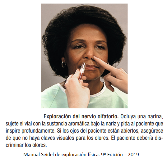 La pérdida del olfato se llama anosmia. Para explorar el olfato se tapa alternativamente uno y otro orificio de la nariz y se pide identificar olores cotidianos (tabaco, alcohol, un perfume, café, etc.). Existen baterías breves normalizadas de diversos aromas. Los fumadores tienen reducido el olfato. Otras personas lo pierden tras rinitis, hemorragias subaracnoideas o traumatismos craneales. La anosmia unilateral ocurre en los tumores (meningiomas) del propio bulbo olfatorio. En algunas enfermedades neurodegenerativas (Parkinson, Alzheimer) se encuentra una anosmia precozmente. En la práctica ordinaria el examen de este nervio tiene muy poco interés.