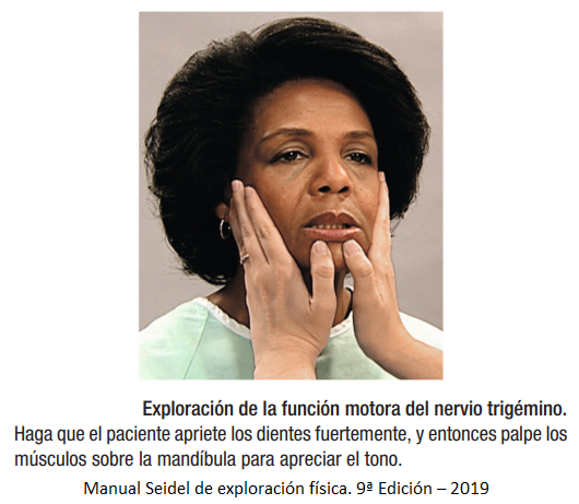 - El nervio trigémino controla los músculos de la masticación y tres divisiones sensitivas de la cara: oftálmica, maxila y mandibular. La parte sensitiva de este nervio también es responsable del relejo corneal junto con el nervio facial (VII par craneal) que controla la respuesta motora. Dado que el nervio trigémino presenta axones motores y sensitivos, usted debe valorar ambos aspectos de la inervación. Para valorar la función de este nervio, pida al paciente que apriete los dientes al tiempo que lleva a cabo la palpación de los músculos temporales y, después, de los músculos maseteros. Tiene que determinar la fuerza de la contracción muscular. Después, pídale al paciente que mueva la mandíbula a ambos lados. Si el paciente tiene dificultades para apretar la mandíbula o para moverla hacia los dos lados, presenta debilidad de los músculos masetero y pterigoideo lateral.