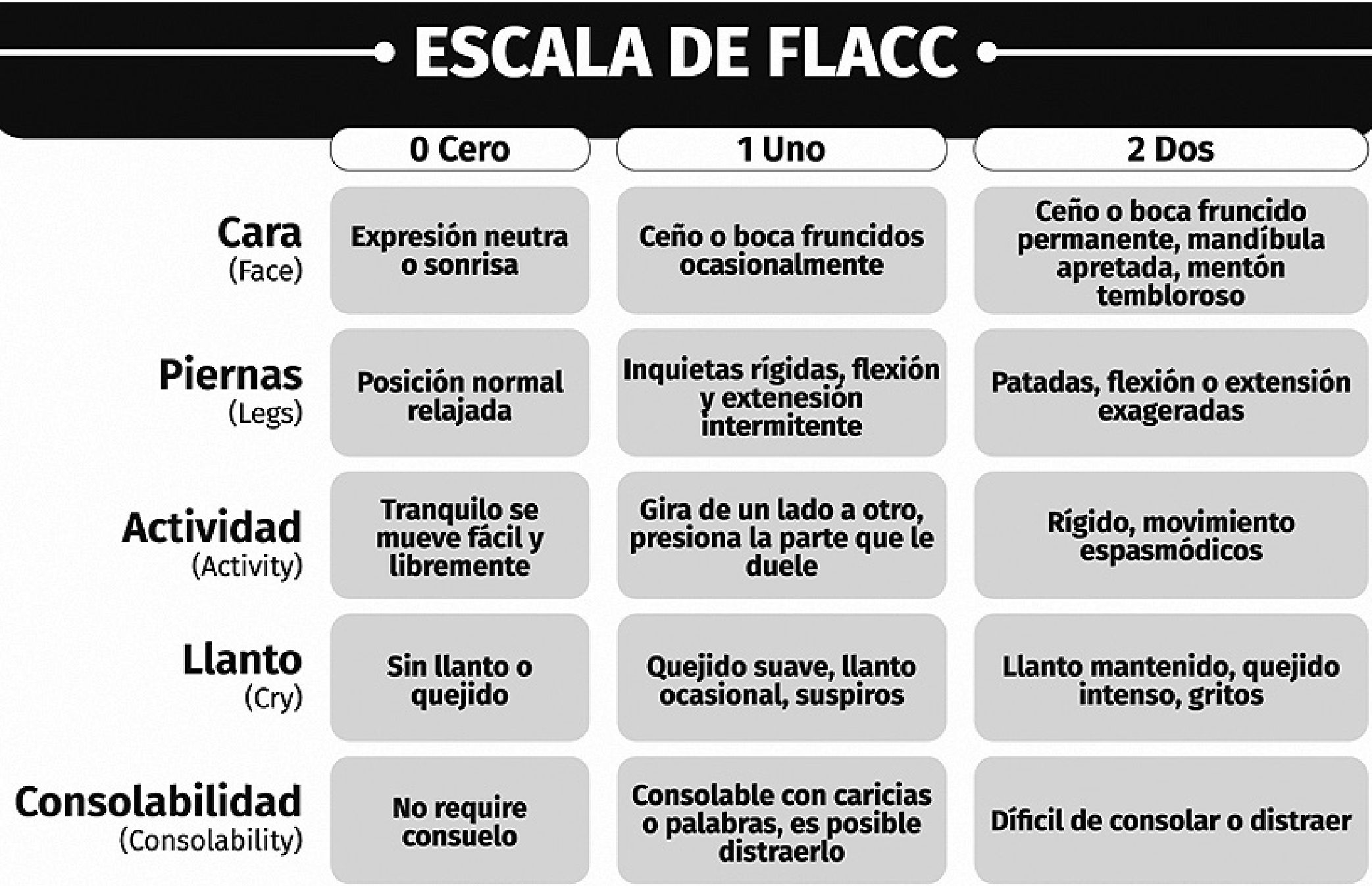- Escala FLACC: Esta escala se utiliza especialmente en niños pequeños y lactantes. Evalúa diferentes aspectos del comportamiento y la expresión facial del niño para determinar su nivel de dolor.